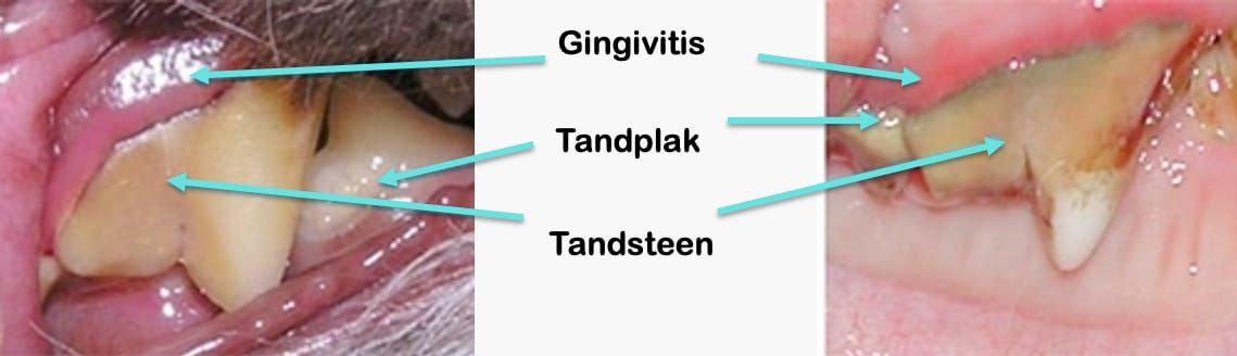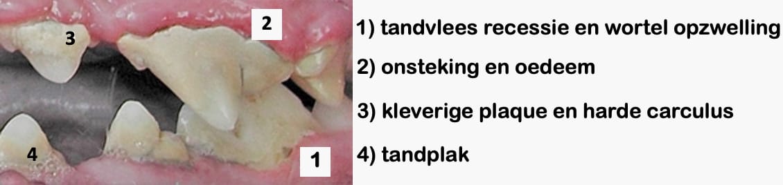 Elke hond zal in meer of mindere mate parodontale aandoeningen ontwikkelen. De eerste fase in het proces is de ontwikkeling van tandplaque, een substantie bestaande uit glycoproteïnen en bacteriën. De bacteriën in de tandplaque kunnen zorgen voor een onwelriekende adem. Vervolgens treedt mineralisatie van de plaque op door respiratie van calciumzouten wat tot tandsteen leidt. De gemineraliseerde plaque geeft aanleiding tot gingivitis en de resulterende weefselschade veroorzaakt parodontitis. Verdere progressie van deparodontitis zal het weefsel rondom de tanden dermate beschadigen waarna verlies van tanden volgt.