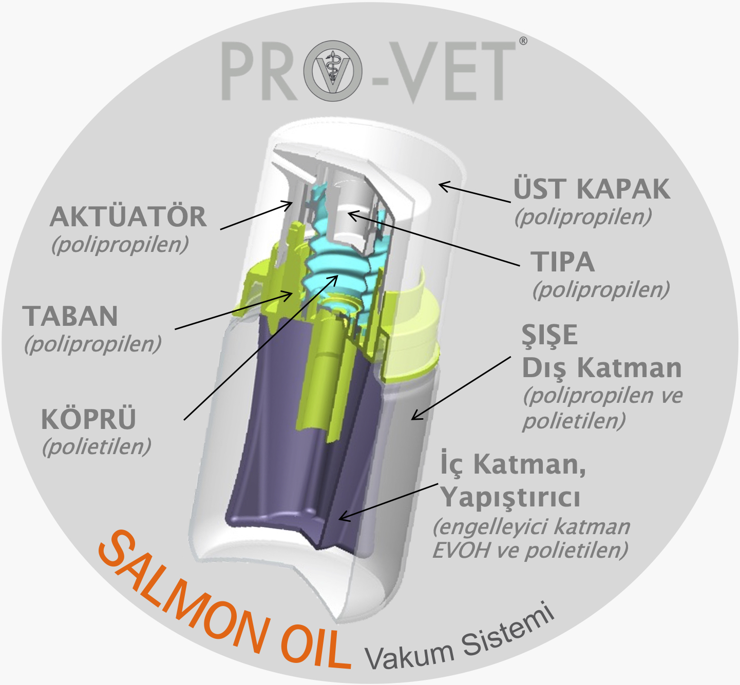 PRO-VET® Salmon Oil, en yüksek kalitede – EPA ve DHA açısından zengin, temel Omega-3-6-9 yağ asitlerinin doğal bir kaynağıdır. Bu yağlar çeşitli hastalık risklerini azaltmaya yardımcı olabilir ve kalp sağlığı üzerinde olumlu etkiler sağlar. DHA, iyi bir görme yetisini korumaya ve beyin fonksiyonlarını desteklemeye yardımcı olur. Yağ, taze balık dokularından yeni bir doğal yöntemle, sert kimyasallar veya yüksek sıcaklık kullanılmadan nazikçe çıkarılır. Kimyasal veya fiziksel “arıtma” işlemlerine maruz bırakılmaz ve kendi iç antioksidan sistemi sayesinde oksidasyona karşı korunur. Dioxin seviyeleri, özel dioxin filtreleme sistemi sayesinde ihmal edilecek düzeydedir. Düşük sıcaklıklı işlem, doğal antioksidanları ve vitaminleri korur.